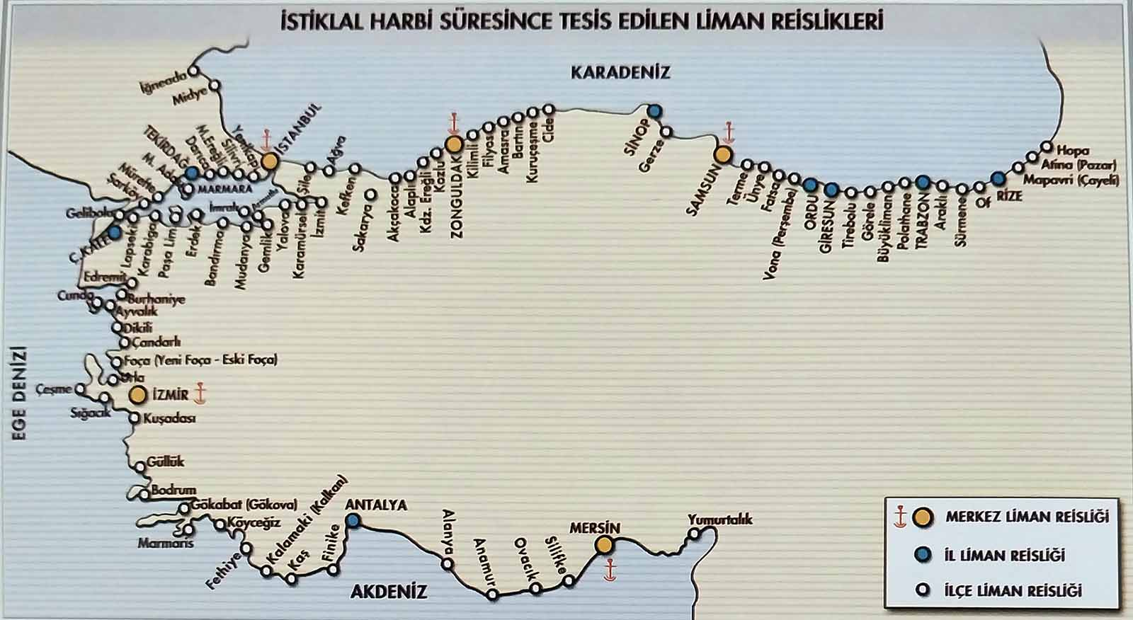 Ayrıca Karadeniz’de Samsun merkez olmak üzere Hopa, Pazar, Çayeli, Rize, Of, Sürmene, Araklı, Trabzon, Görele, Tirebolu, Giresun, Ordu, Fatsa, Ünye, Terme, Gerze ve Sinop’ta liman başkanlıklarına görevlendirmeler yapılmıştı. Zonguldak merkez olmak üzere de Cide, Kurucaşile, Amasra, Bartın, Filyos, Kilimli, Kozlu, Ereğli, Alaplı ve Akçakoca’da da liman başkanlıkları kurulmuş ve her birinin başında deniz subayları görevlendirilmişti. Doğu Akdeniz, Ege ve Marmara limanları bu listeye dahil değildi, çünkü işgal altındaydılar. Bu bölgeler, işgal güçlerinin iradesi altındaki Osmanlı Bahriye Nezareti emrindeydiler.