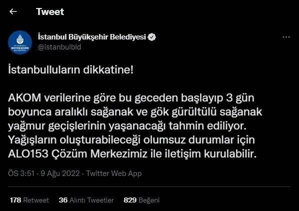 Konuyla ilgili İstanbul Büyükşehir Belediyesi (İBB) tarafından da bir açıklama metni yayınlandı ve vatandaşlara 3 gün sürecek yağışla ilgili uyarıda bulunuldu.