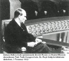 3 Temmuz 1932 – Ankara Halkevi’nde (günümüzde Devlet Resim ve Heykel Müzesi) düzenlenen Türk Tarih Kongresi’nde Dr. Reşit Galip’in bildirisini dinlerken