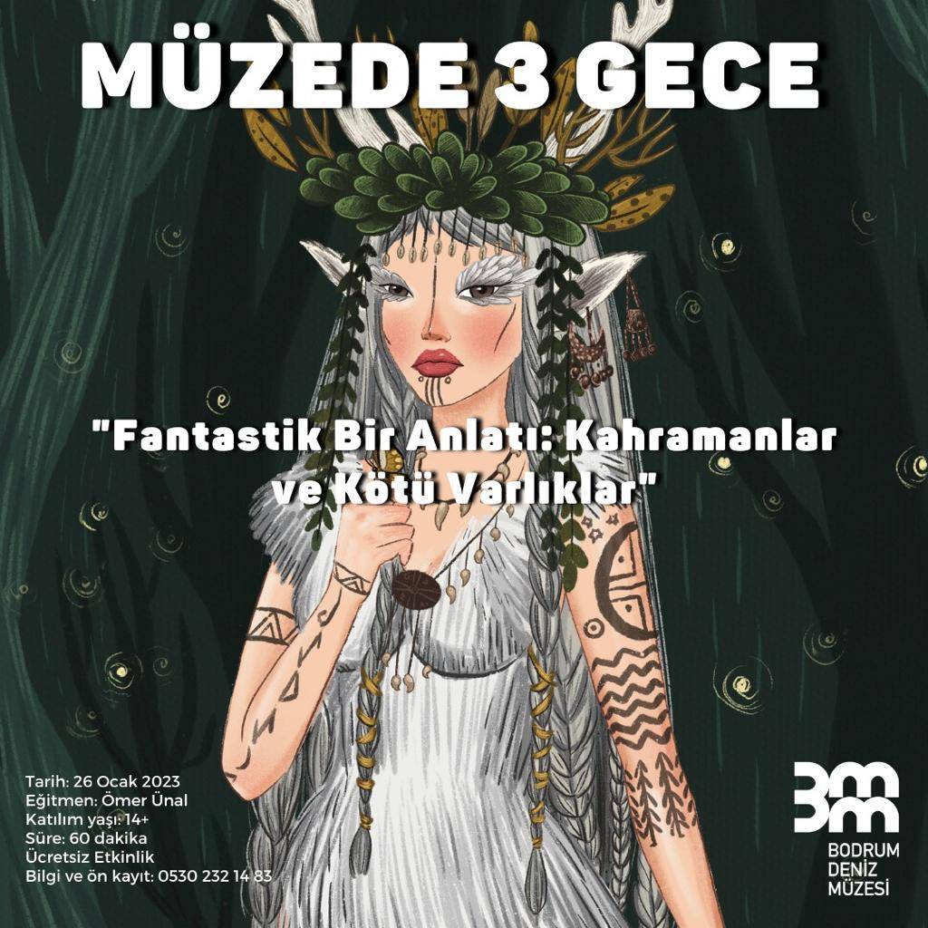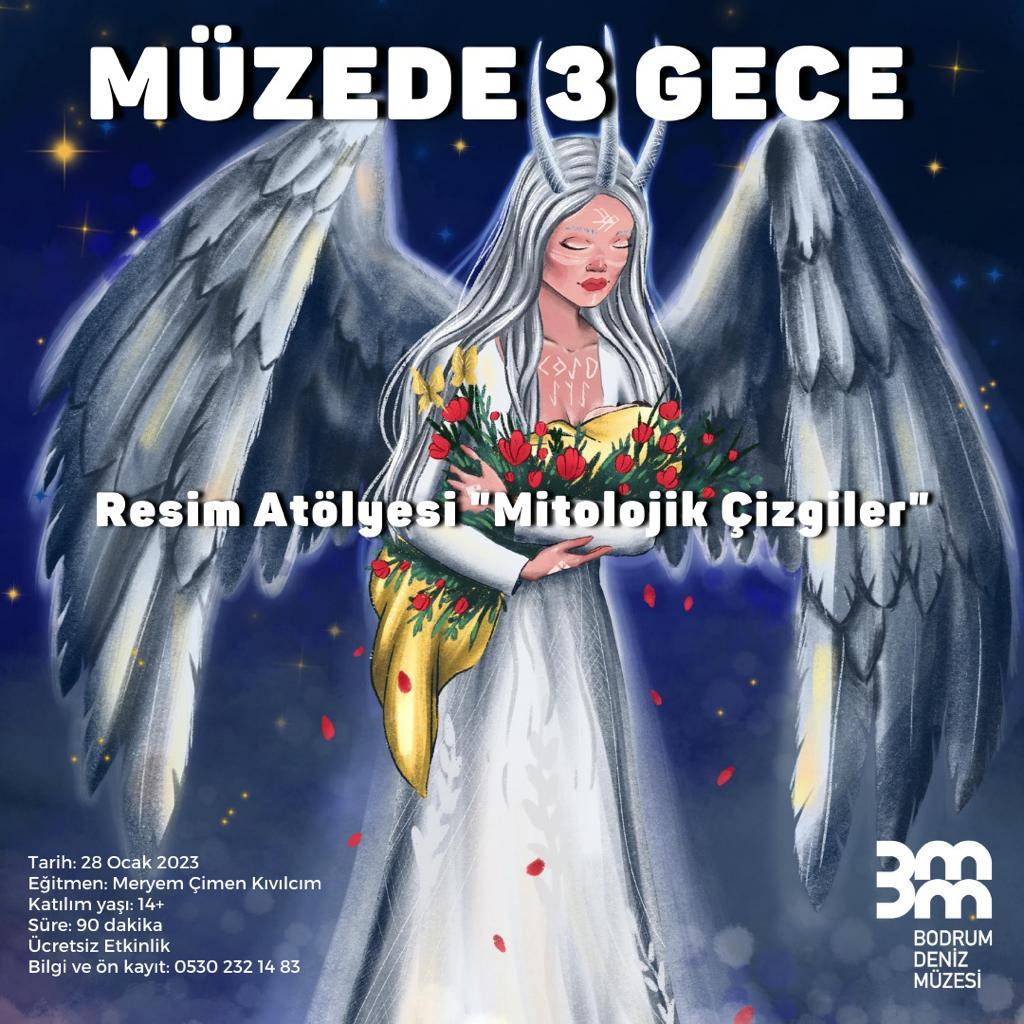 Çizer/İllüstratör Meryem Çimen Kıvılcım tarafından yorumlanmış olan mitoloji, fantazma dolu çalışmalar, programın başladığı 26 Ocak tarihinde meraklısıyla buluşmaya başlamıştı. 28 Ocak tarihine kadar müzede izlenmeye devam edilebilecek mitoloji ve illüstrasyon içerikli çalışmalarla, fantazma dünyasına dalmak isteyen herkes müzede resimlerle buluşabiliyor. Bodrum Deniz Müzesinde ücretsiz olarak gerçekleştirilen “Müzede 3 Gece” atölyeleri 28 Ocak akşamı son bulacak. Sanatın, masalın ve mitolojinin yer alığı bu etkinlikleri kaçırmak istemeyen 14 yaş üstü gençler ve yetişkinlerin 0 530 232 14 83 numaralı telefondan ücretsiz katılım için kayıt yaptırması yeterli oluyor.