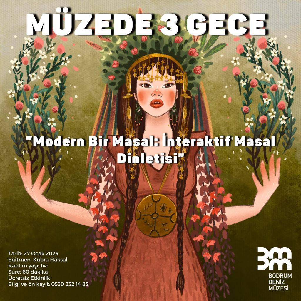 27 Ocak akşamı saat 20.00’de müzede “Modern Bir Masal: İnteraktif Masal Dinletisi” Bodrum halkına sunuluyor. Masal Anlatıcısı/Eğitimci Kübra Haksal’ın anlatımıyla metaforik ögelerle beslenmiş interaktif masal dinletisi heyecanla bekleniyor. Katılımcılar ile birlikte yürüyen dinletide, Kübra Haksal’ın bir kukla karakteri olan Çuçu da katılımcılara eşlik edecek.