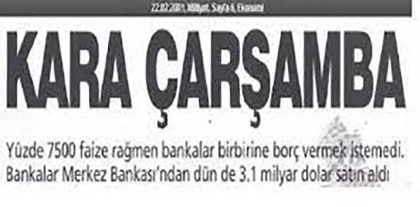 2001 – Türkiye kamuoyunda, “Kara Çarşamba” olarak adlandırılan büyük bir ekonomik kriz patlak verdi. Bankalar arası para piyasasında gecelik faiz, %6200’e kadar çıktı.