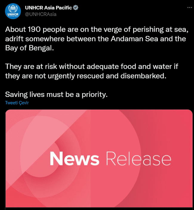 24 Aralık’ta BM(Birleşmiş Milletler) Twitter hesabından paylaştığı Andaman Denizi ve Bengal körfezi arasında mahsur kalan ve akıntıyla sürüklenen 190 mülteci için yardım çağrısında bulunmuştu. Yaptığı paylaşımda:
