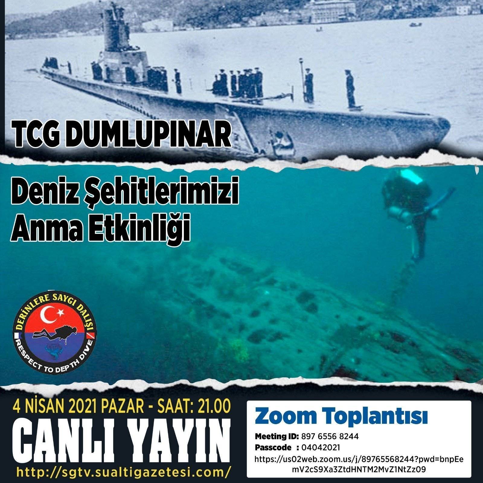 Akdeniz’de katıldığı NATO tatbikatından dönerken 4 Nisan 1953 günü İsveç bayraklı yük gemisi Naboland ile çarpışarak batan TCG Dumlupınar, Türk denizcilik tarihinin en büyük denizaltı faciası olmuştu. Çanakkale Boğazı'nın Nara Burnu açıklarında 81 denizciyle birlikte 85 metre derinliğe gömülen TCG Dumlupınar’ı, Derinlere Saygı Dalış Topluluğu anacak. Suyun altında unutulan ulusal değerlerimizin hatırlanması ve toplumun bilinçlenmesi için çalışan Derinlere Saygı Dalış Topluluğu, 68 yıl önce yaşanan facianın nedenlerini ve ardından yaşanan gelişmeleri Zoom üzerinden sanal bir konferans ile anlatmaya çalışacak.