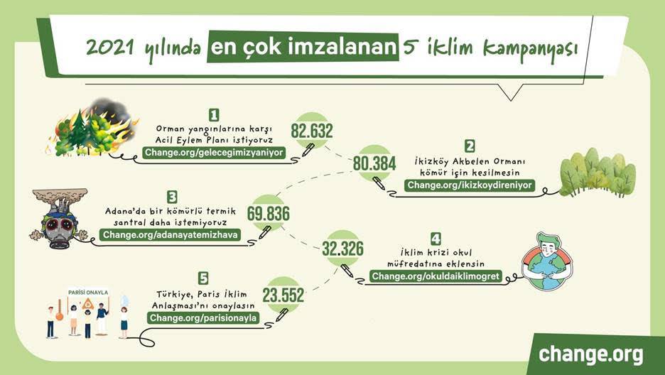 Başarılar da aynı şekilde artmaya devam etti: 2020 yılında doğa koruma alanındaki başarılı kampanyaların sayısı ikiye katlandı. 2021 yılında en çok imzalanan 5 iklim kampanyasından 2’si başarıya ulaştı. Bu rehberin iklim alanında daha çok kampanyanın başlatılmasına ve başarıya ulaşmasına destek olacağını umuyoruz.”