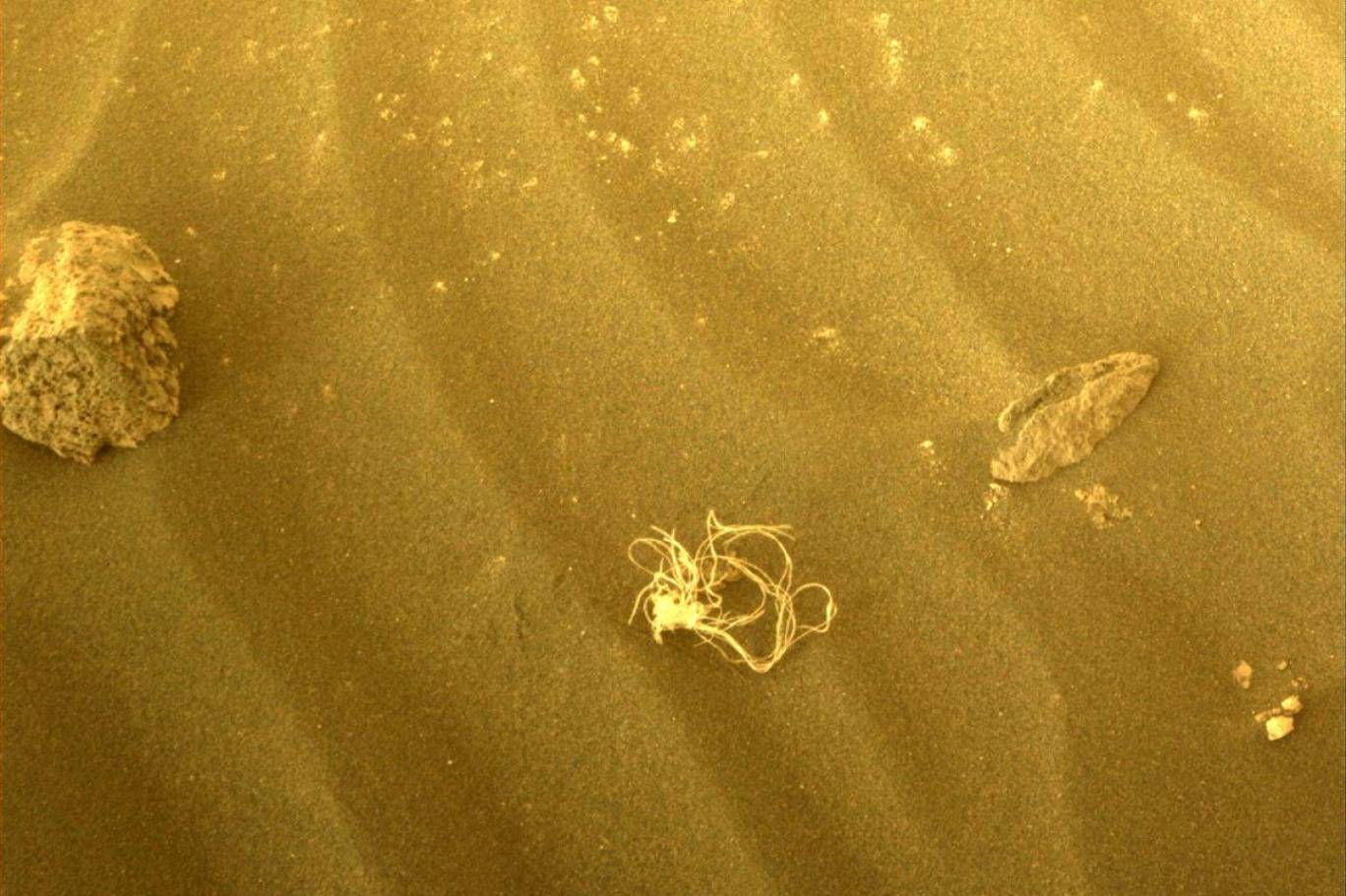 NASA tarafından yapılan açıklamada, biyolojik ve uzay kökenli olmayan madde olarak tanımlanan tuhaf nesnenin, Şubat 2021’de keşif aracı Perseverance‘i Mars yüzeyine indiren giriş, alçalma ve iniş (EDL) donanımına ait Dacron ağının birbirine dolanmış bir parçası olduğunu açıklandı.