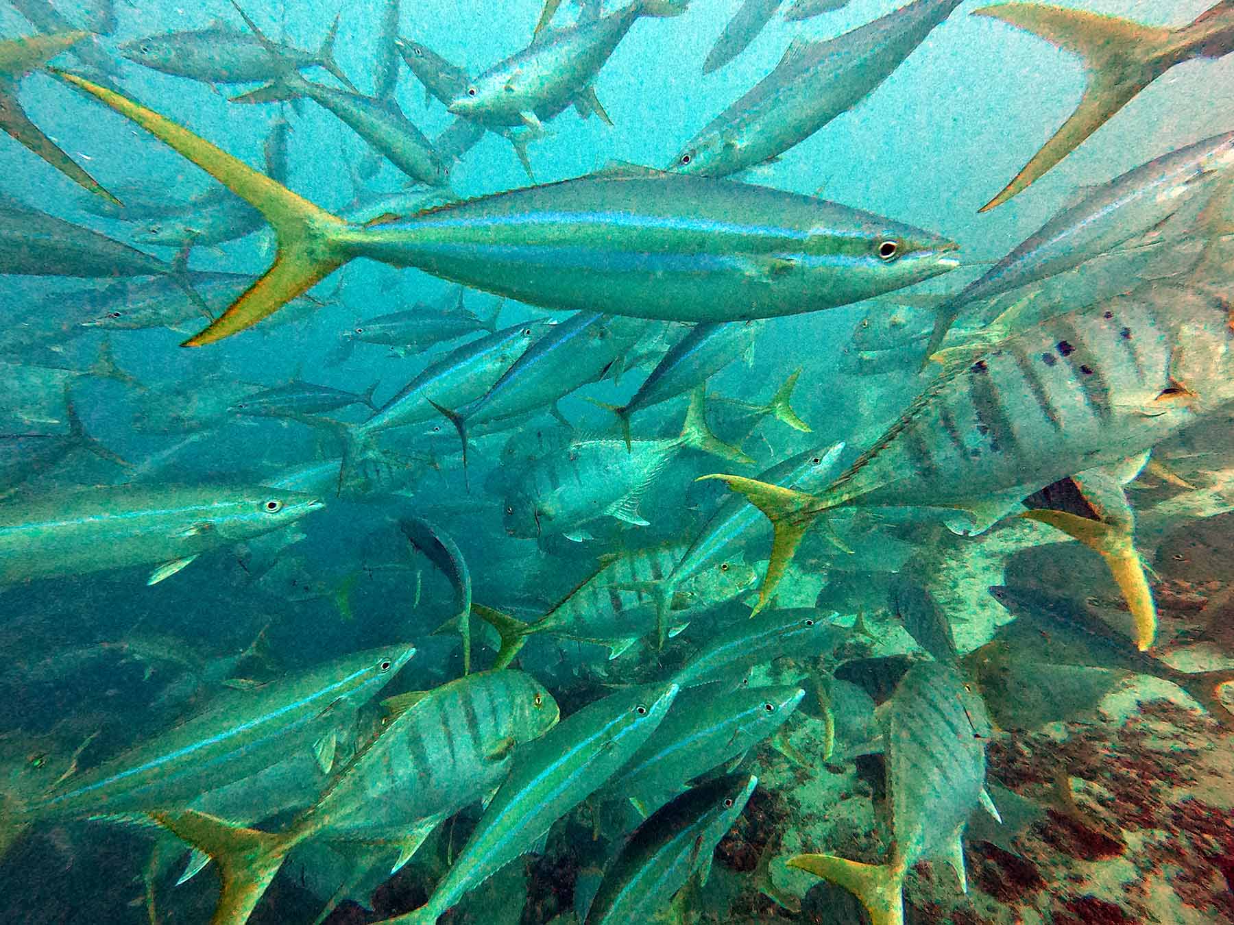 Yaşam alanları tehlike altındaki türlerin başında gelen köpekbalıklarından biriyle karşılaşmış olmanın heyecanını doğanın kuralları gereği 1-2 dakika ile sınırlandırarak uzaklaşırken, 14 metre derinlikte başka bir büyüleyici buluşmanın içinde buluyoruz kendimizi. Yüzlerce bireyden oluşan altın kral balığı (Golden Trevally) sürüsü etrafımızı sararken içlerinde zargana, baraküda ve uskumru gibi tanıdık balıkların yakın akrabalarını görmenin mutluluğunu yaşadık. Balık sürüsünün yaklaşık 1 dakika süren geçişi sırasında hiçbirinin birbirine çarpmadan hatta dalgıçların arasından bile büyük ahenkle geçtiklerini görmek doğanın müthiş dengesinin bir sonucuydu.
