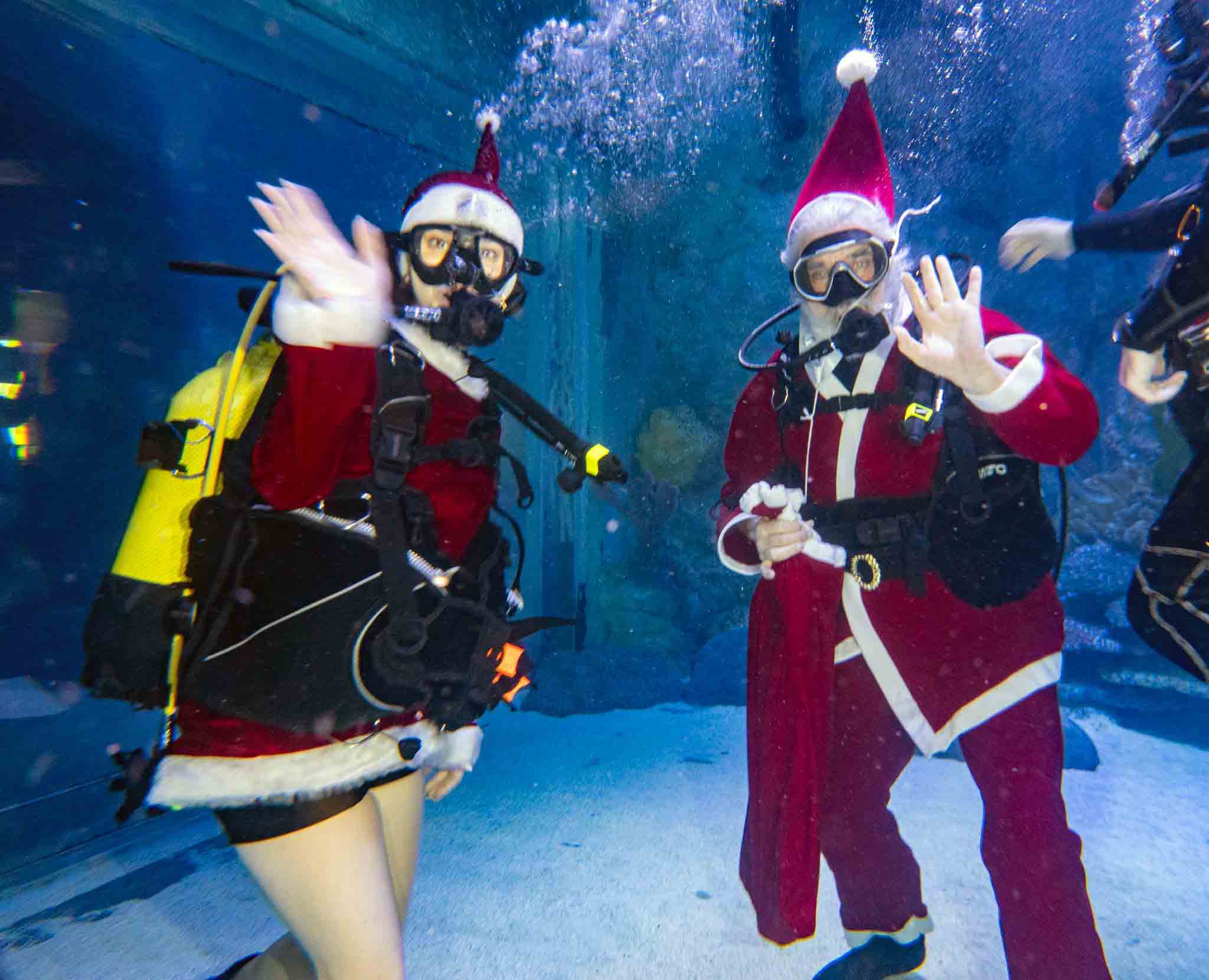 Şişli’deki Down Cafe’de çalışarak hayata ve üretime katılan 18-30 yaş aralığındaki down sendromlu genç ve çocuklar için Derinlere Saygı Dalışı Topluluğu, özel bir dalış düzenledi. EMAAR Akvaryum’da suya giren Noel Baba- Saruhan Singen ile Noel Anne- Sinem Balaç, 15 özel çocuğun her biri için heybelerinden oyuncak çıkarttı. Köpekbalıkları ve egzotik hayvanlar eşliğinde dalarak heybelerindeki oyuncakları çocuklara gösteren dalgıçlar daha sonra dışarı çıkarak onlarla buluştu.