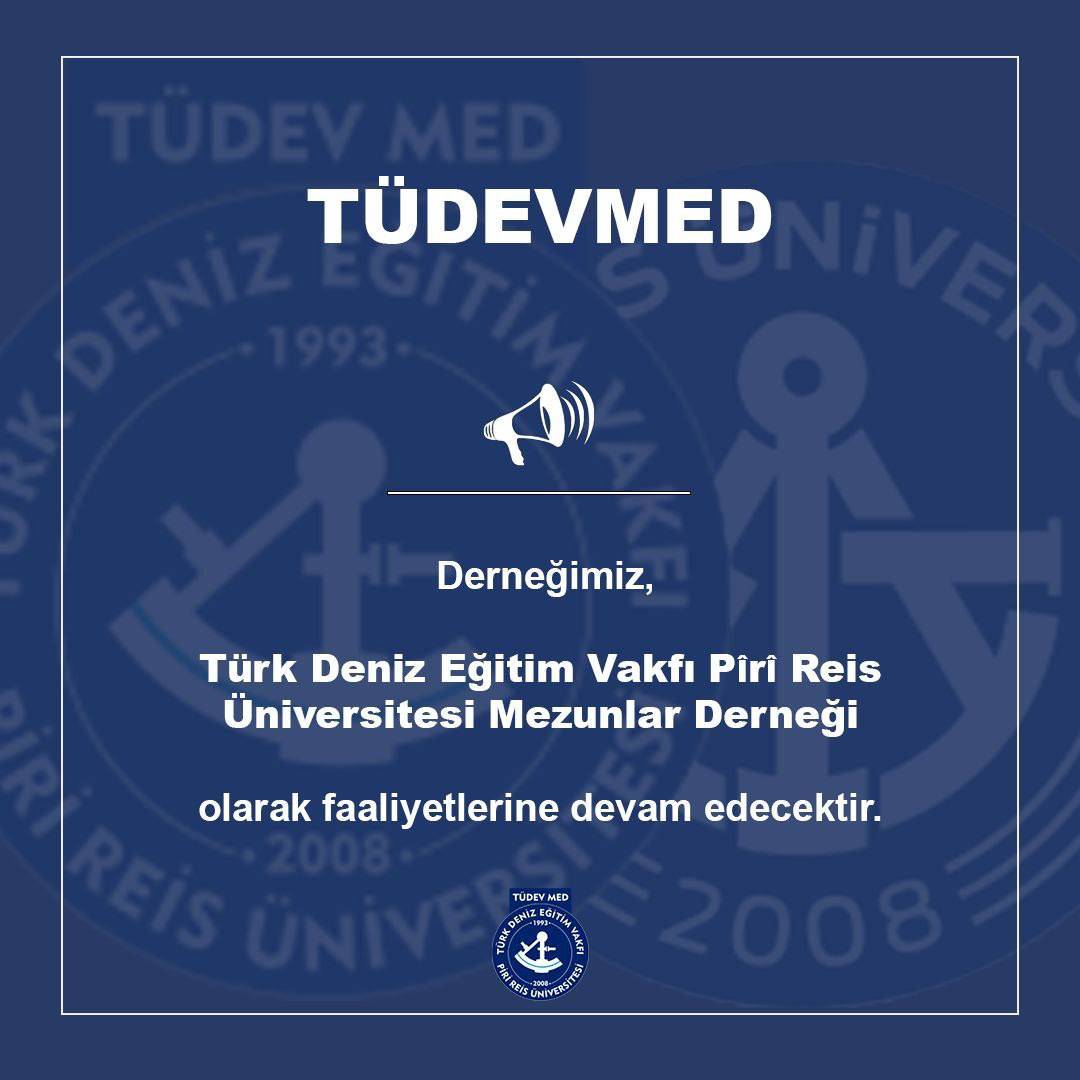 “Türk Deniz Eğitim Vakfı Piri Reis Üniversitesi Mezunlar Derneği” olarak, Türk Deniz Eğitim Vakfı (TÜDEV) tarafından kurulmuş TÜDEV Eğitim Merkezi ve Piri Reis Üniversitesi mezunlarını ve öğrencilerini aynı çatı altı toplayan TÜDEVMED; 13 Kasım 2021 tarihinde düzenlenen Olağan Genel Kurul Toplantısında, TÜDEVMED’in açılımının genişletilmesine, kimliğinin günümüz çizgisine taşınarak daha kapsayıcı bir yapıya bürünmesi gerektiğine olan inançla, TÜDEVMED’in mevcut algısını koruyarak Derneğin markalaşma sürecini kolaylaştırmak ve algısını güçlendirmek amacıyla ismini ve tüzüğünün ilgili maddelerini “Türk Deniz Eğitim Vakfı Piri Reis Üniversitesi Mezunlar Derneği” olarak değiştirmiştir.