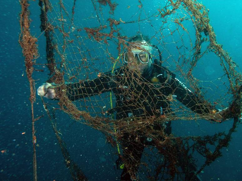 Normalde balıkçıların hassas alanlara, derin olup kayalık olan bölgelere, ağlarını atmamaları gerekiyor. Kaybolması muhtemel olan bir yere ağ atmak, kendi geleceğini kör etmek oluyor. Onlarda da bu bilinci sağlamaya çalışıyoruz ama maalesef çok da başarılı olduğumuzu söyleyemem. Bugüne kadar yaptığımız çalışmalarda 1 gırgır ağı parçası aldık. Yaklaşık 1 basketbol sahası kadar büyüklükteydi. Bir tane de trol ağı aldık. O da yine 1 basketbol sahası büyüklüğüne denk gelir” diye konuştu.
