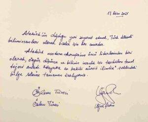 Türkiye’nin Atina Büyükelçisi Burak Özügergin’in karşıladığı Türeci ve Şahin, Atatürk Evi’ndeki anı defterine şunları yazdı: