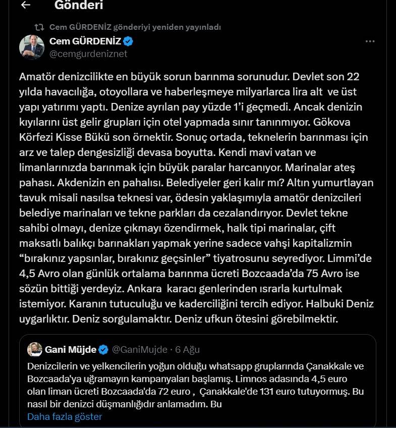 Denizcilerin ve yelkencilerin yoğun olduğu whatsapp gruplarında Çanakkale ve Bozcaada’ya uğramayın kampanyaları başlamış. Limnos adasında 4,5 euro olan liman ücreti Bozcaada’da 72 euro, Çanakkale’de 131 euro tutuyormuş. Bu nasıl bir denizci düşmanlığıdır anlamadım. Bu insanların çoğu emekliliğini denizde geçirmeye çalışan insanlar. Daha acıklısı her iki Belediye de CHP belediyesi. İnsaf yahu…@bozcaada_bld@ckalebelediye@canakkale