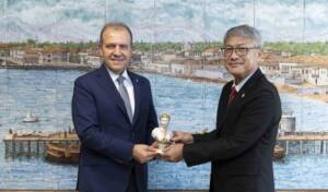 Kushimoto Belediye Başkanı Katsumasa Tashima ise nazik karşılama için teşekkür ederek konuşmasına başladı. Refah Şehitleri Anıtı’nda düzenlenen törenin görkemli bir şekilde gerçekleştiğini ifade eden Tashima, “11 senelik aradan sonra tekrar Mersin’e geldim. Belediye binasının yenilendiğini gördüm. Harika bir mekân olmuş tebrik ediyorum” dedi. Japonya ve Türkiye arasındaki dostluğun uzun süredir devam ettiğini belirten Tashima, bundan sonraki süreçte de Türkiye ile iletişimi sıklaştıracaklarını aktardı. Tashima, kendi kentlerinde Ertuğrul Fırkateyni anısına düzenlenecek olan tören hakkında detaylı bilgiler vererek, “16 Eylül’de yani Ertuğrul’un battığı gün, battığı yerde bir tören düzenleyeceğiz. Japonya Türkiye Büyükelçiliği ile beraber düzenleyeceğiz” ifadelerinin ardından Seçer’i de törene davet etti. Ziyaret; fotoğraf çekimi ve karşılıklı hediye takdimi ile sona erdi.